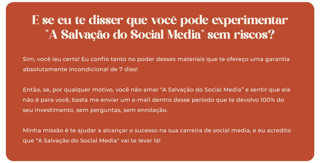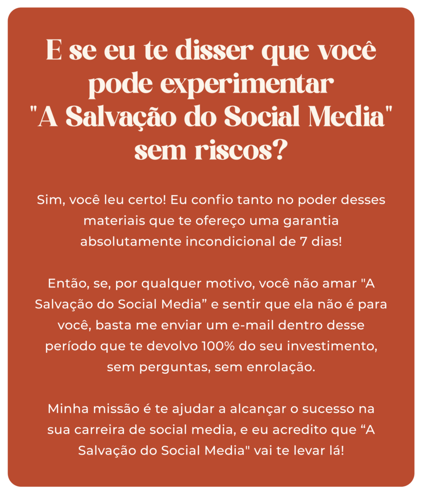 Você terá acesso à “Solução do Social Media” por 1 ano! E não para por aí, durante esse período você também terá acesso ao grupo exclusivo no WhatsApp e a todas as atualizações dos modelos do Canva e dos quadros do Trello. O intuito aqui é não deixar você e seus clientes na mão.